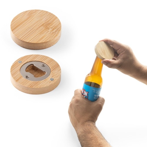 Dessous de verre aimanté en bambou avec décapsuleur intégré. Le produit étant fabriqué à partir de matériaux naturels, la couleur du produit ainsi que le résultat de l’impression peuvent varier d’un produit à l’autre