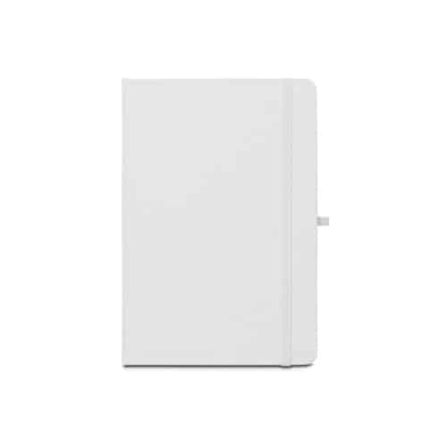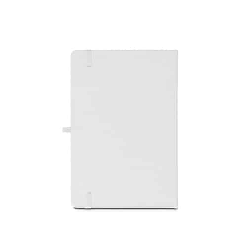 Cahier A5 à couverture rigide, idéal pour la personnalisation par sublimation. Le carnet en polyester recyclé 300D (100% rPET) comporte 160 pages lignées sur papier ivoire 100% recyclé (70 g/m²), un ruban, un porte-bille (non inclus) et une fermeture élastique