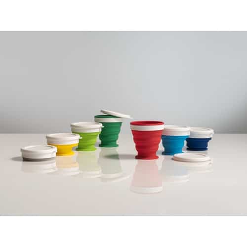 Verre de voyage pliable en silicone avec couvercle en PP. Contient une poignée sur le couvercle. Capacité jusqu’à 250 mL