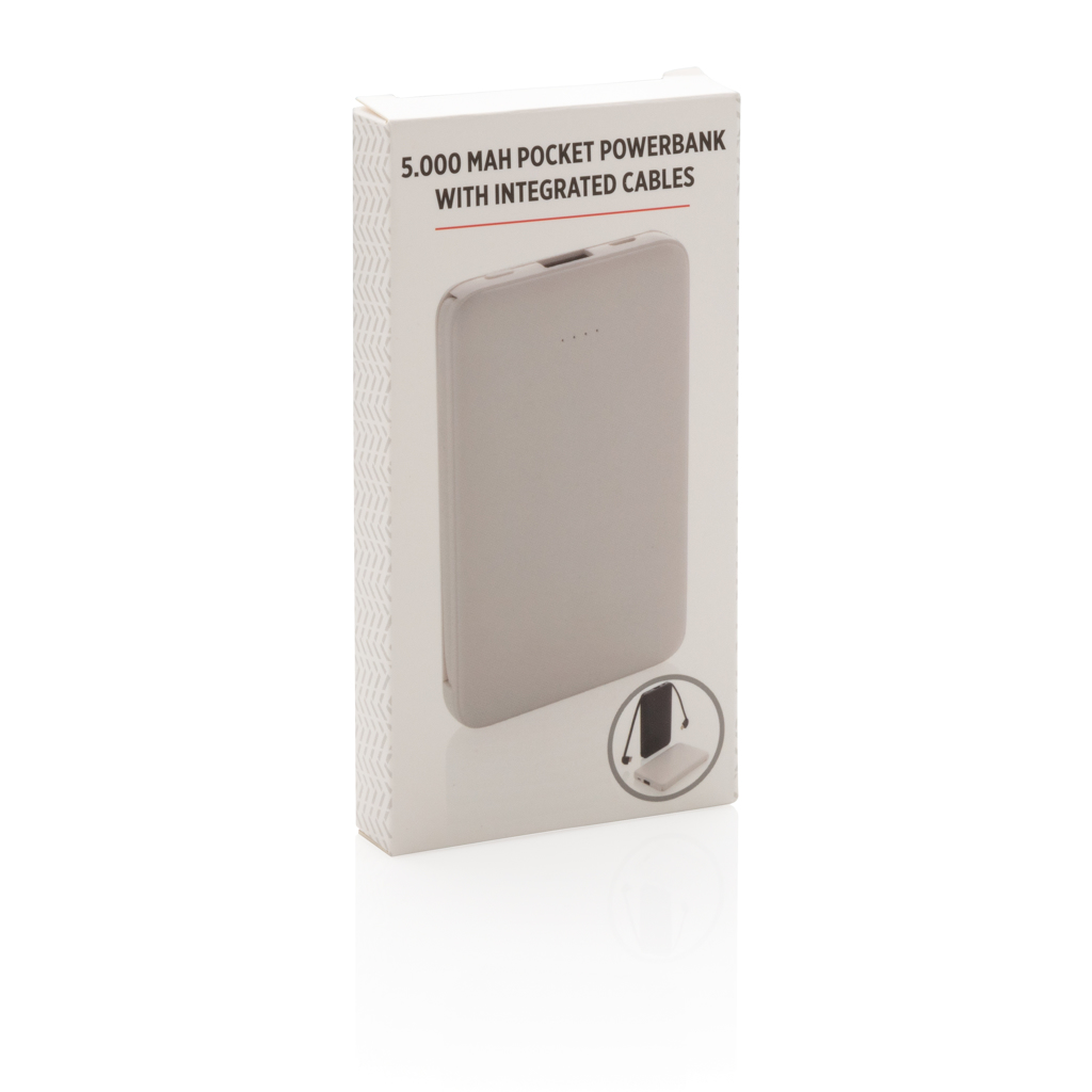 Batterie de secours 5000 mAh avec câbles intégrés, idéale pour recharger tous vos appareils en mobilité.