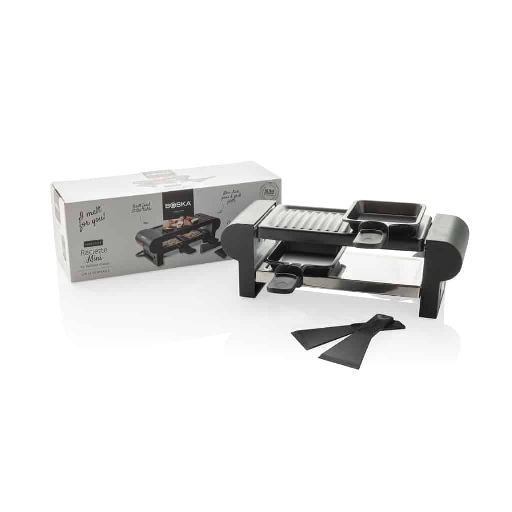 Découvrez le mini appareil à raclette 220V BOSKA, idéal pour des repas chaleureux et conviviaux à deux.