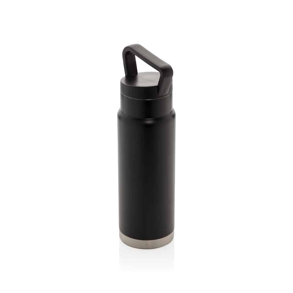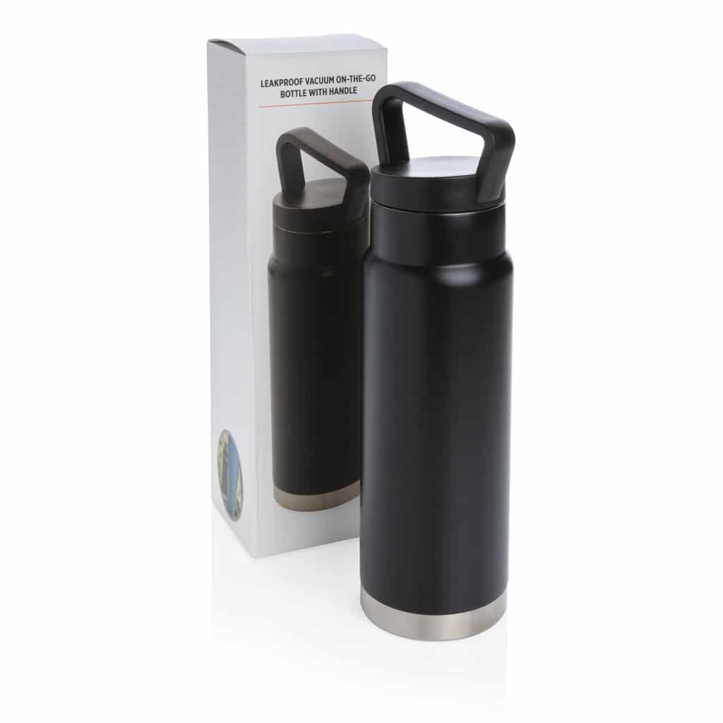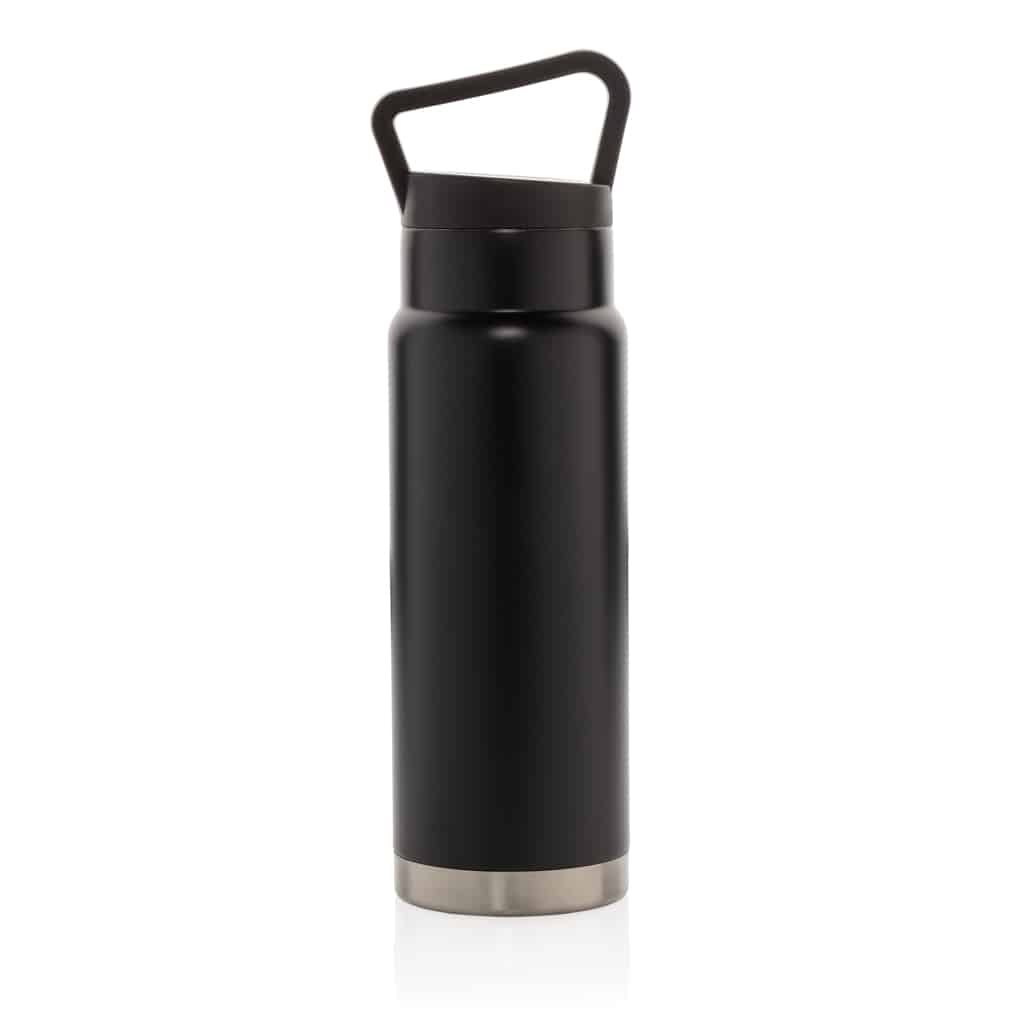 Bouteille isotherme étanche avec poignée, idéale pour garder boissons chaudes ou froides lors de vos déplacements professionnels.