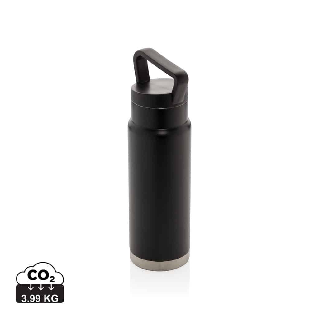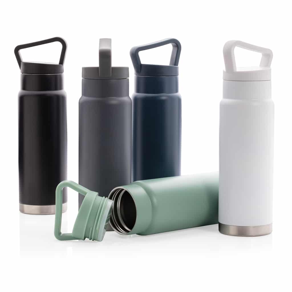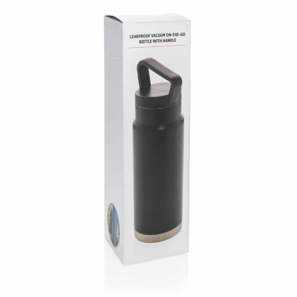 Bouteille isotherme étanche avec poignée, idéale pour garder boissons chaudes ou froides lors de vos déplacements professionnels.