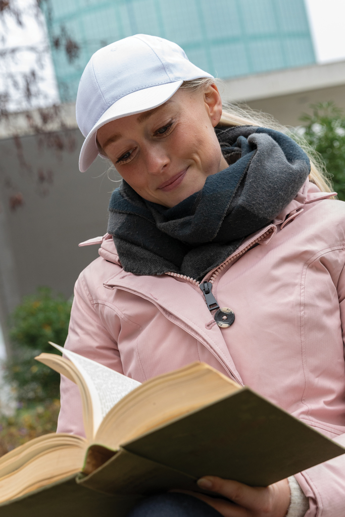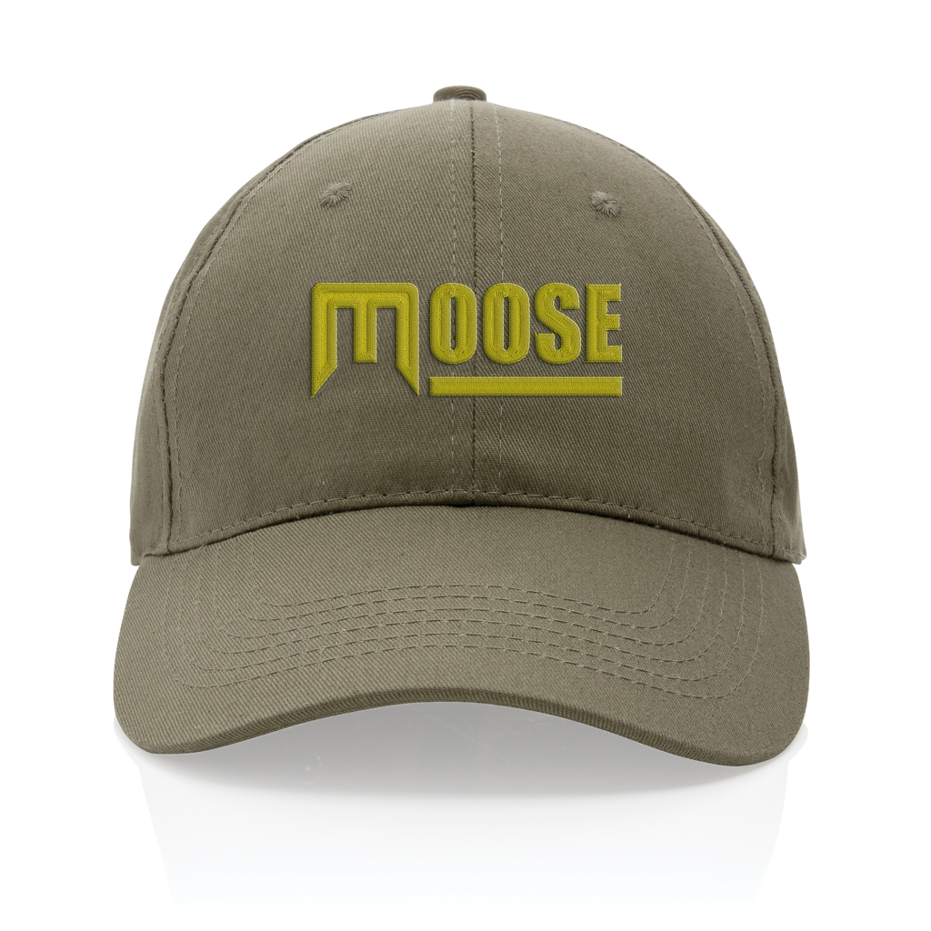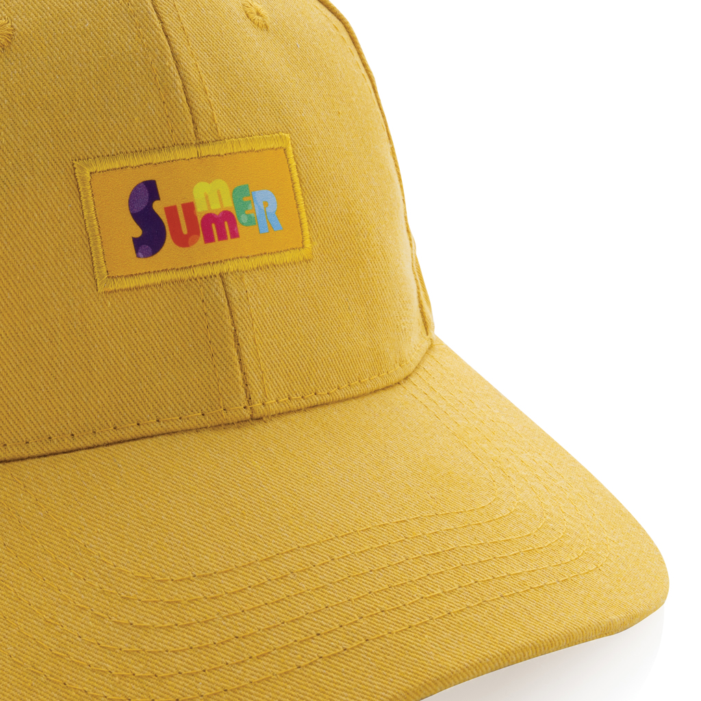 Casquette 6 panneaux en coton recyclé, idéale pour une communication responsable et visible.