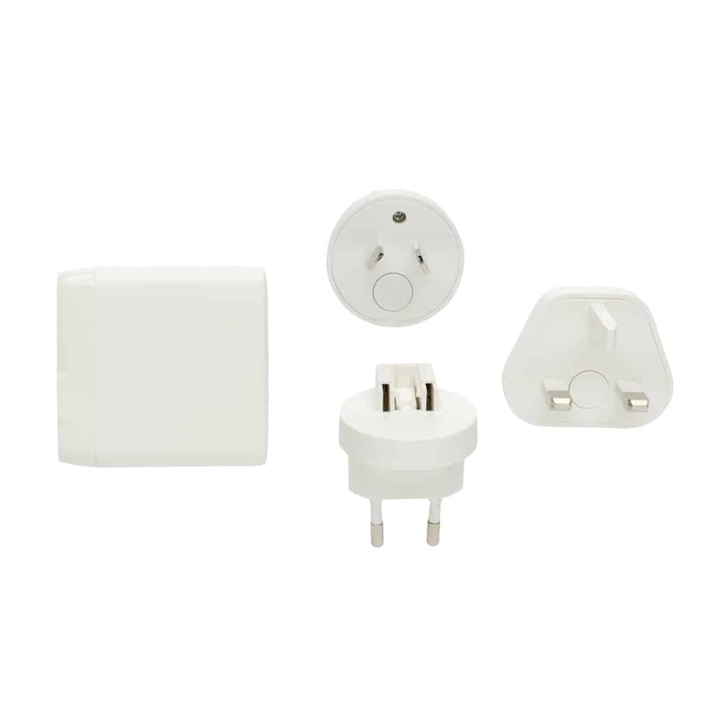 Le TravelCharge Pro est un chargeur de voyage pratique et performant, conçu pour répondre aux besoins des professionnels en déplacement. Il dispose de 2 ports USB-C et de 2 ports USB-A, permettant de recharger simultanément smartphones, tablettes et autres appareils électroniques. Grâce à ses prises intégrées pour les États-Unis ainsi que des adaptateurs pour l’UE, le Royaume-Uni et l’Australie, il offre une compatibilité dans plus de 100 pays. Sa sortie maximale de 5V/3A assure une charge rapide et sécurisée, tandis que sa large plage d’entrée AC100-240V le rend compatible avec la plupart des sources électriques mondiales.