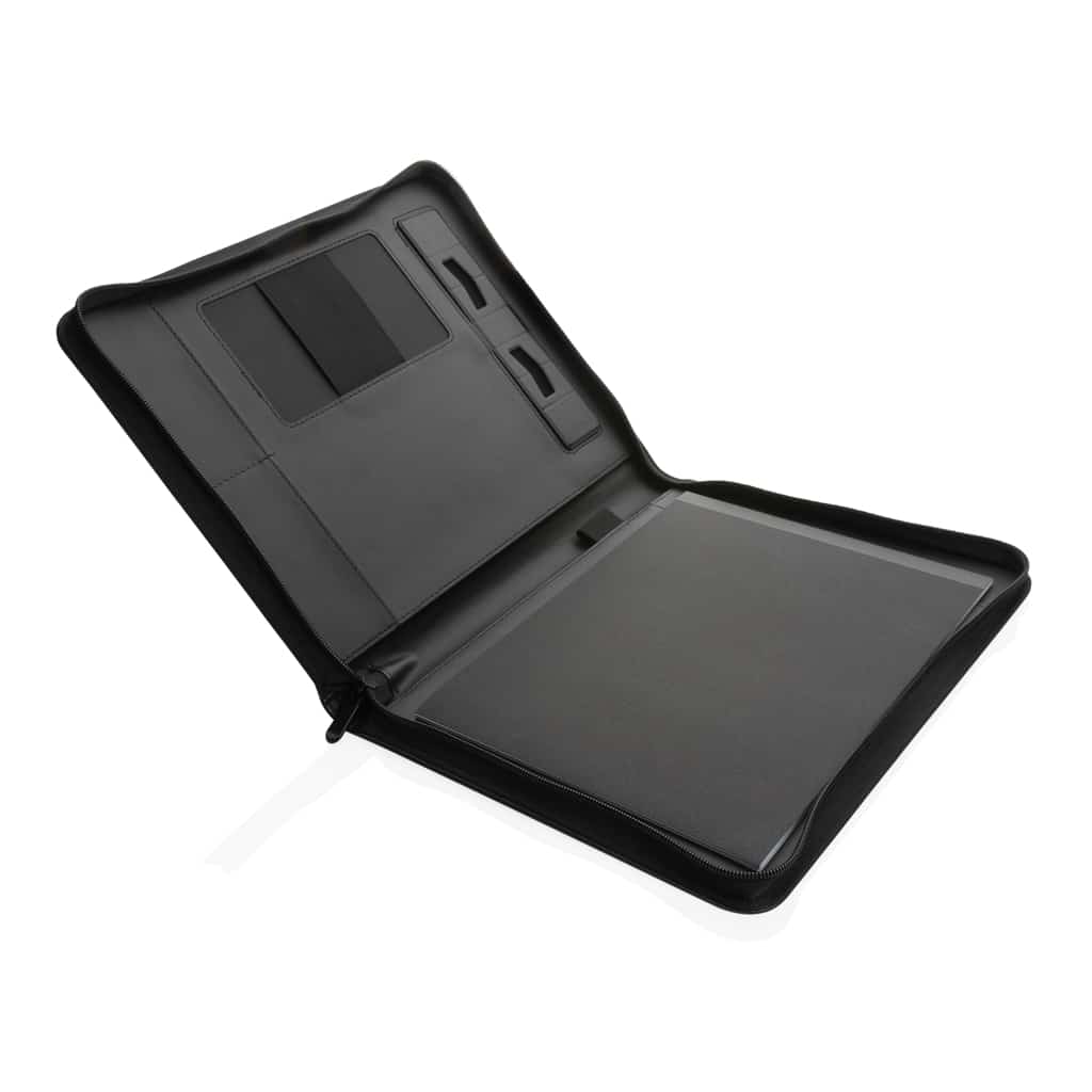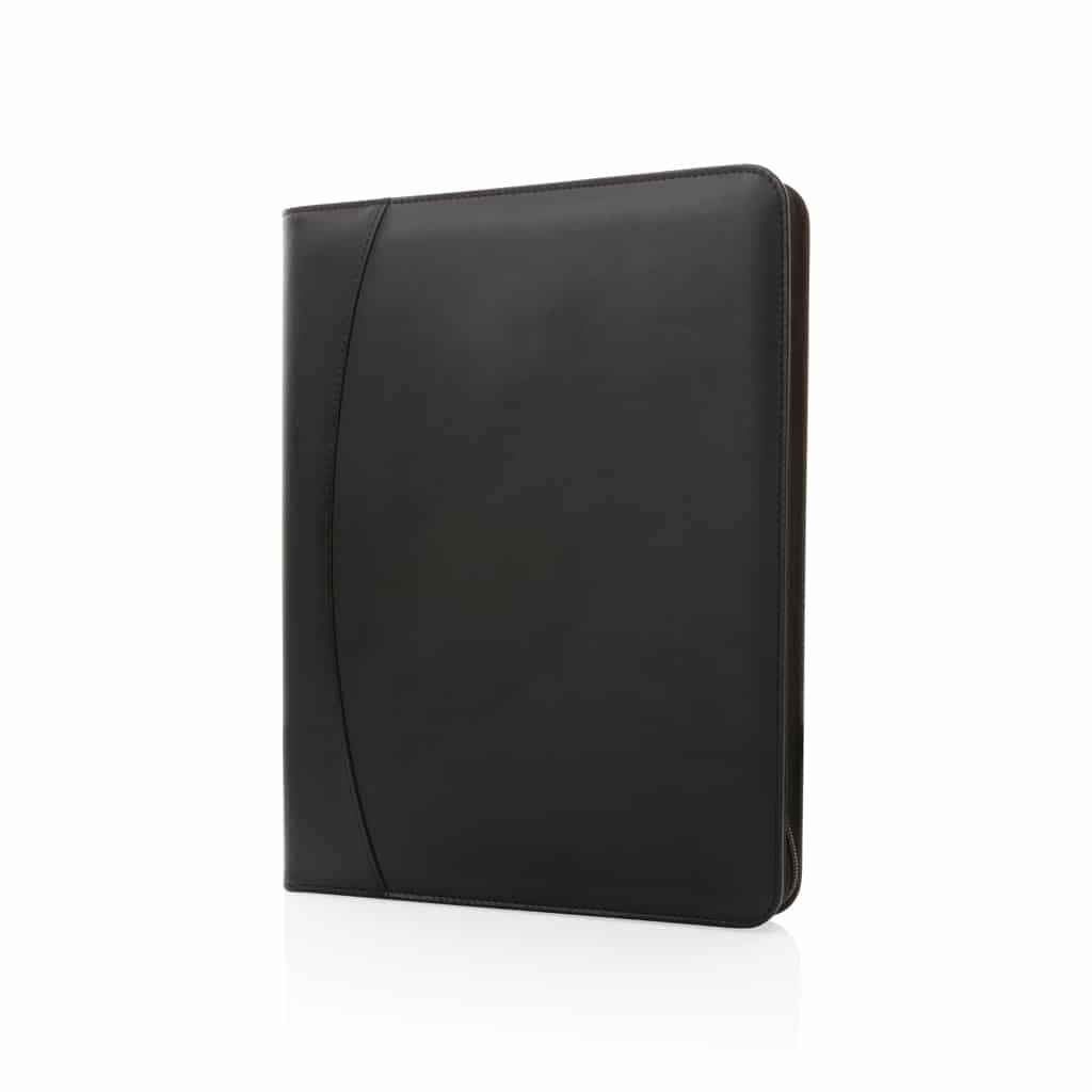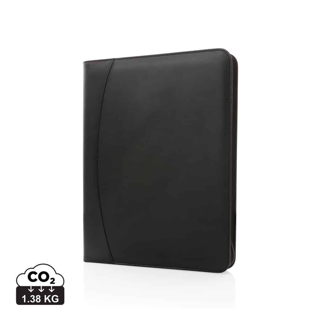 Ce conférencier avec fermeture à zip est conçu en rPU certifié RCS, garantissant une chaîne d’approvisionnement responsable et un matériau recyclé de qualité. Sa surface lisse offre un aspect chic et moderne idéal pour les professionnels soucieux de leur impact écologique. Le bloc-notes intégré, en papier recyclé 64 g/m², contient 20 pages lignées, parfait pour prendre des notes précises lors de vos rendez-vous.