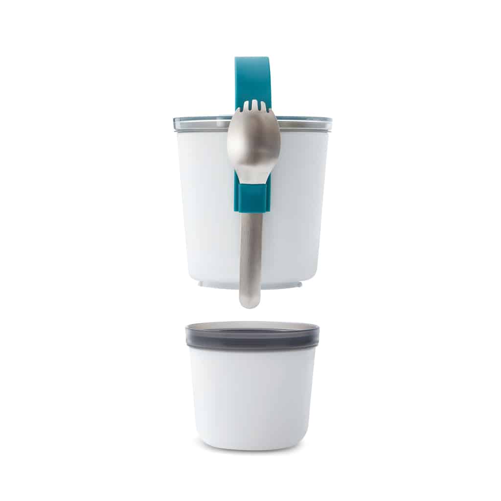 Le conteneur à lunch Black+Blum Original est inspiré des porte-tiffins indiens, revisité pour offrir un format plus fin et plus haut, idéal pour glisser dans un sac. Conçu avec deux pots étanches qui se verrouillent ensemble, il permet de séparer et conserver plusieurs aliments, du yaourt aux soupes, en toute sécurité. Sa sangle en silicone maintient l’ensemble ainsi que la "spork" en acier inoxydable, un ustensile combiné fourchette/cuillère, facilitant ainsi le transport et l’utilisation. Ce boîtier passe au micro-ondes et au lave-vaisselle, à l’exception du couvercle en tritan, garantissant une hygiène optimale.