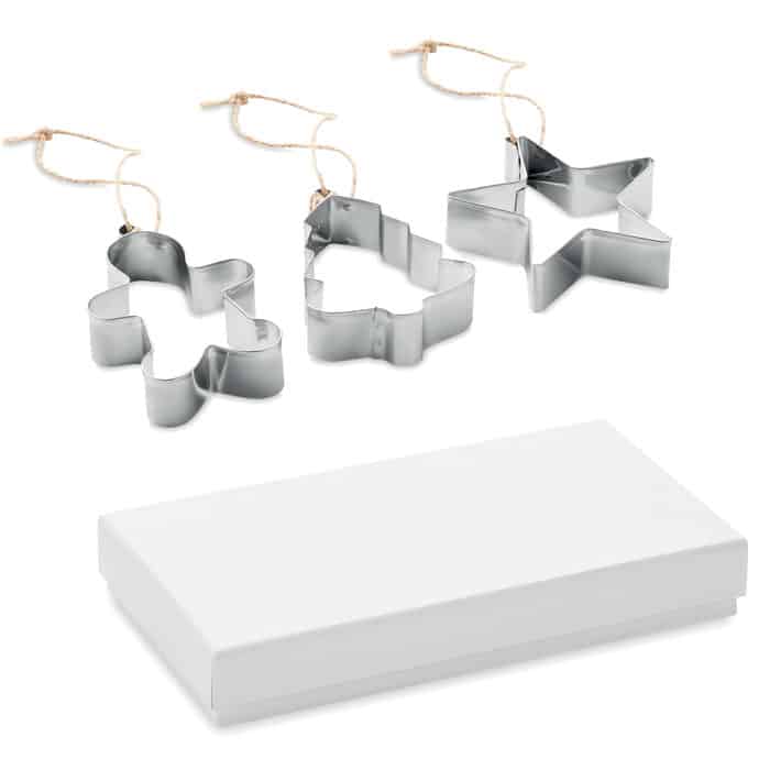 Le CUQUI SET comprend trois découpoirs à biscuits en acier inoxydable, attachés par un cordon en jute naturel. Ce set allie praticité et esthétique, pouvant aussi servir de décoration, notamment comme ornement pour sapin. Ce double usage renforce la visibilité de votre marque tout au long de l’année.