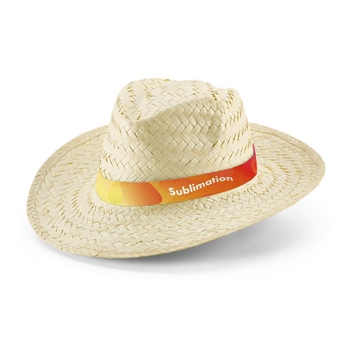 Le chapeau en paille naturelle avec ruban sublimé personnalisable allie élégance et visibilité pour votre communication d’entreprise.