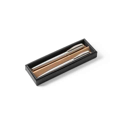 Set de stylos à bille et rollers avec corps avec clip en acier inoxydable (53% recyclé). Ecriture noire. Stylo à bille doté d’un mécanisme twist. Livré dans une boîte cadeau en papier kraft fabriquée à partir de matériaux certifiés FSC™ et d’autres matériaux contrôlés