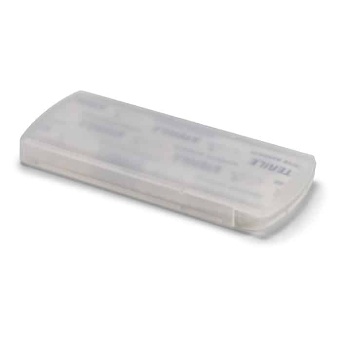 Le kit EVAN se compose d'un étui en plastique compact contenant 5 pansements adhésifs, un format pratique et hygiénique. Cet objet promotionnel est parfait pour associer utilité et visibilité. Facile à transporter, il s’intègre aisément dans les pochettes ou sacs, offrant une présence discrète mais efficace de votre marque.