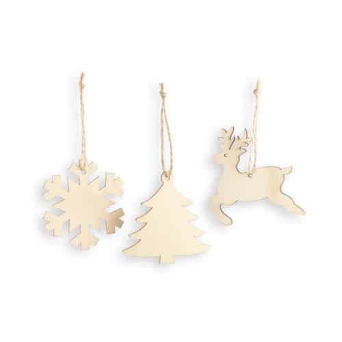 Ensemble de décorations de Noël en contreplaqué personnalisables, parfaites pour valoriser votre communication d’entreprise.