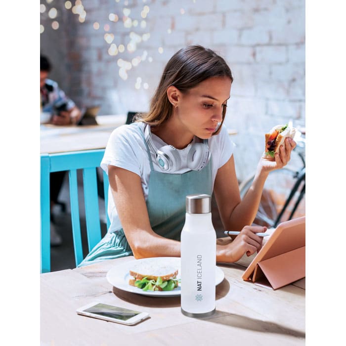 Facile à transporter et étanche, la GLACIER RPET accompagne vos collaborateurs et clients au quotidien, qu'ils soient au bureau ou en déplacement. Sa capacité généreuse permet une hydratation optimale, tandis que sa conception robuste garantit une utilisation durable. Notez qu’elle n’est pas adaptée aux boissons gazeuses.