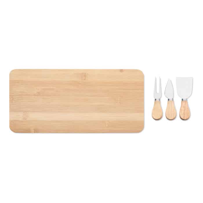 Le set à fromage en bambou GLENAVY comprend une planche de service accompagnée de deux couteaux et une fourchette assortis, conçus pour une présentation raffinée de fromages et autres apéritifs. Fabriqué en bambou 100 % certifié FSC®, ce produit valorise votre communication responsable grâce à une matière écologique et durable. Chaque pièce présente des variations naturelles de couleur et de taille, renforçant son caractère unique et authentique.