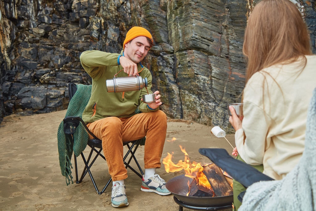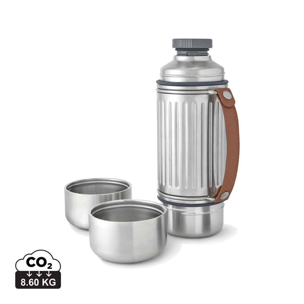 Contenance de 1 litre avec deux tasses à double paroi pour conserver la température des boissons. Sangle en nylon pour un transport aisé.