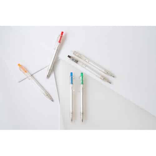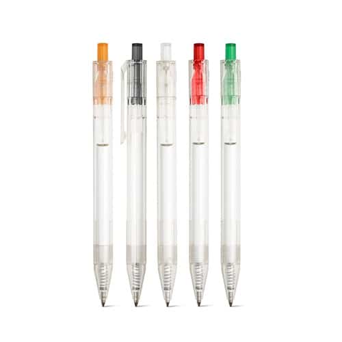 Stylo à bille en 100% rPET transparent avec bouton coloré. Encre noire
