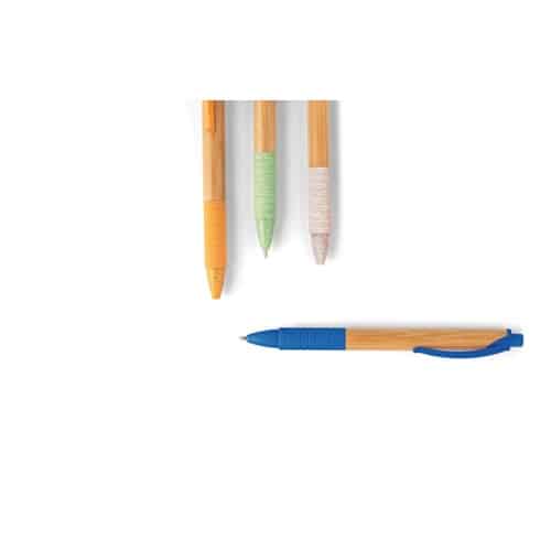 Le corps du stylo est en bambou naturel, complété par un clip antidérapant ainsi que des éléments colorés en fibre de blé et ABS, garantissant une prise en main confortable et sûre.