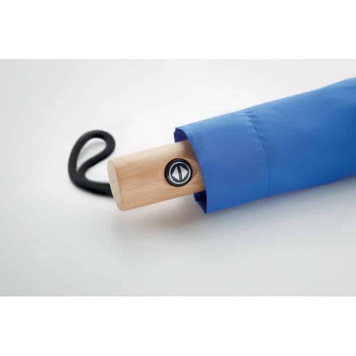 Ce parapluie de 23 pouces offre une ouverture et une fermeture automatiques en trois volets, facilitant son usage au quotidien. Sa structure en fibres de verre garantit robustesse et résistance face aux intempéries, tandis que sa poignée en bambou naturel avec sangle en coton assure confort et prise en main agréable. Livré avec une housse assortie en RPET, il se transporte facilement.