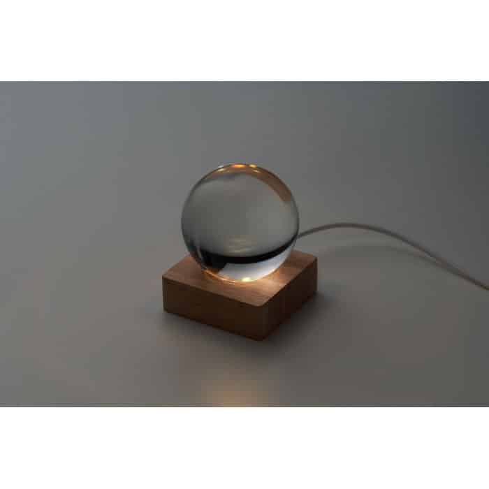 Socle en bois de caoutchouc certifié FSC 100%, boule en verre, câble USB de 90 cm.
