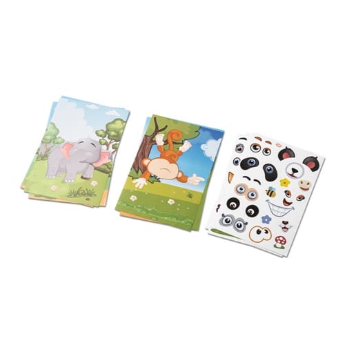 Jeux d’autocollants composé de six feuilles avec des figurines d’animaux à décorer : singe, âne, girafe, éléphant, vache et panda. Avec plus de 60 autocollants pour s’amuser