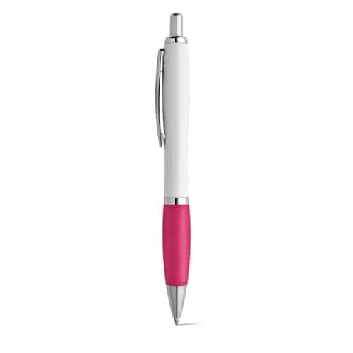 Stylo à bille en ABS blanc avec clip en métal et grip coloré. Disponible dans une large gamme de couleurs. Écriture noire