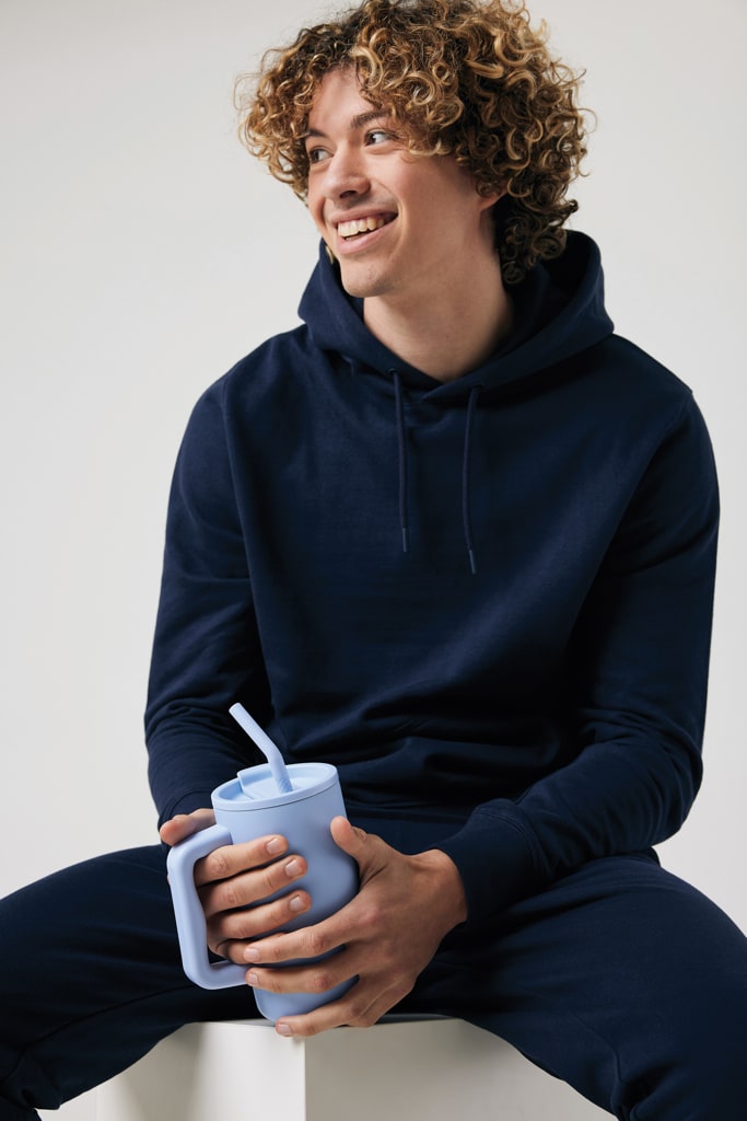 Ce mug 800 ml est conçu en acier inoxydable recyclé, garantissant un impact environnemental réduit grâce à sa certification RCS. Sa structure à double paroi isolée sous vide assure une excellente conservation des températures, que ce soit pour des boissons chaudes ou froides. La poignée robuste et la large base confèrent stabilité et confort d’utilisation, idéales pour les environnements professionnels tels que les bureaux.