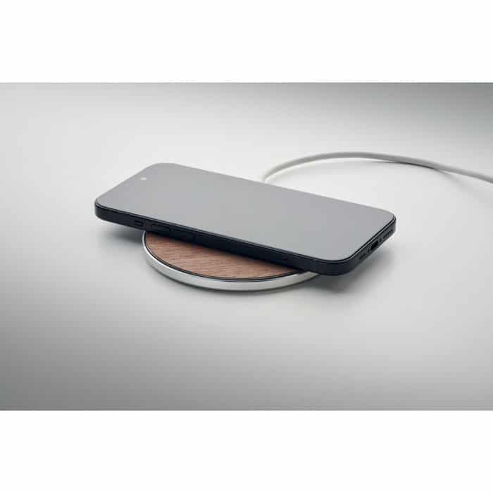Chargeur sans fil en aluminium recyclé avec détail en noyer, idéal pour la communication d’entreprise.
