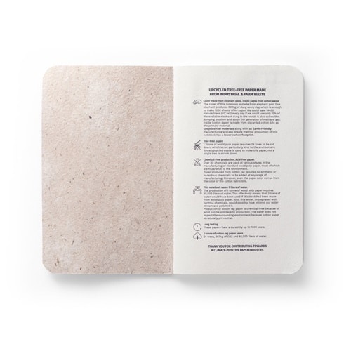Ce bloc-notes A6 se distingue par sa couverture souple composée à 80 % de matière organique d'éléphant et à 20 % de déchets de coton, offrant une texture unique et naturelle. Le papier intérieur, fabriqué à 100 % à partir de déchets de coton, est particulièrement résistant, garantissant une expérience d’écriture agréable et durable. Avec ses 52 pages unies et une bande décorative, cet article publicitaire allie esthétique et fonctionnalité, tout en respectant l’environnement.