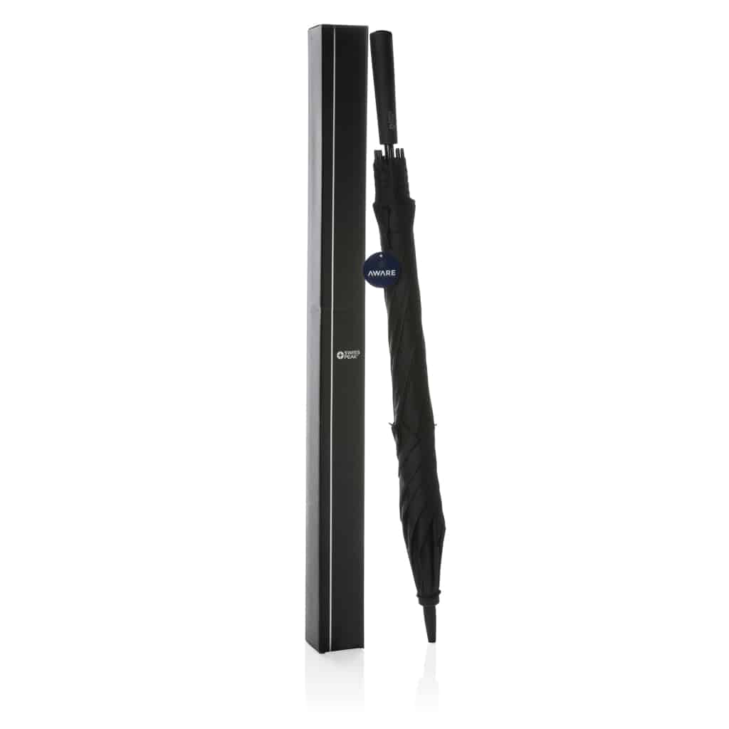 Le parapluie tempête 23" Swiss Peak AWARE™ Tornado allie robustesse et design écoresponsable pour une communication d’entreprise efficace.