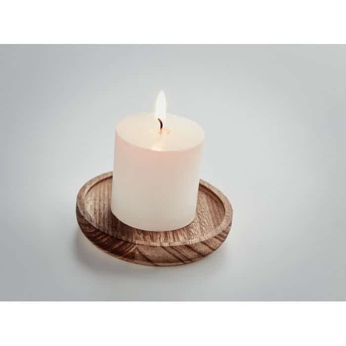 La bougie PENTAS se distingue par sa base décorative en bois ronde et son parfum vanille subtil, créant une atmosphère chaleureuse et raffinée. Pesant 88 grammes, ce produit allie design épuré et fonctionnalité, idéal pour mettre en valeur votre logo ou message personnalisé.