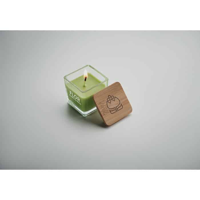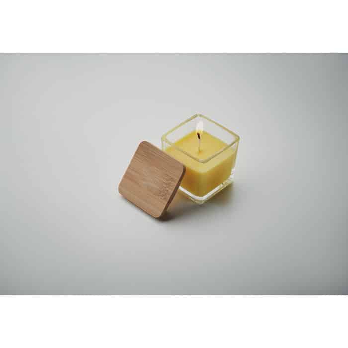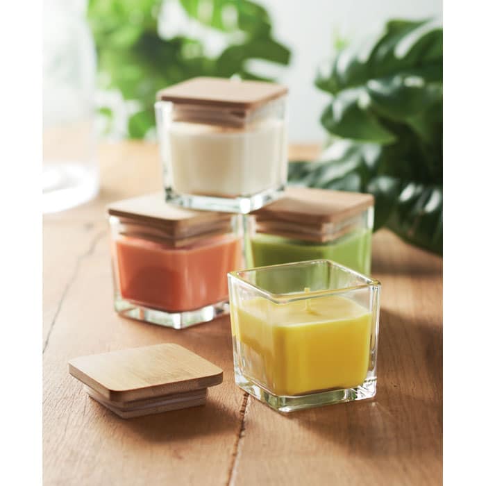 Cette bougie est fabriquée à partir de cire végétale parfumée et présentée dans un verre carré, agrémenté d’un couvercle en bambou naturel. Quatre parfums sont disponibles : vanille (blanc 06), citron (jaune 08), orange (orange 10) et pomme (vert 48).