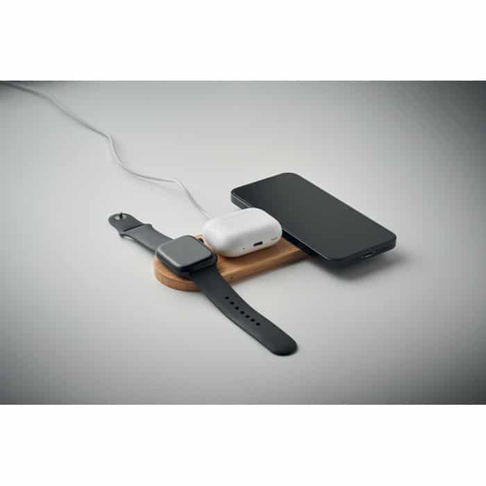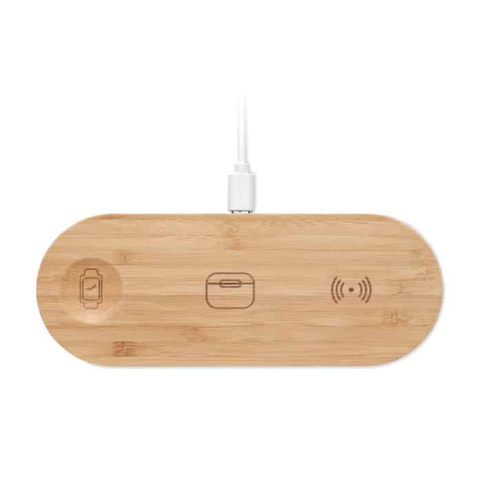 Le RECPAD est une station de charge 3 en 1 intégrée dans un élégant boîtier en bambou, qui permet de recharger simultanément un smartphone via un chargeur sans fil 15W, une montre connectée Apple® et des écouteurs TWS. Ce produit allie modernité et durabilité grâce à son matériau naturel, offrant ainsi une image de marque responsable et innovante.