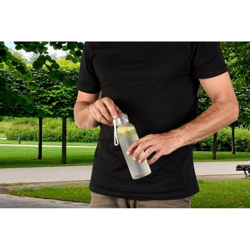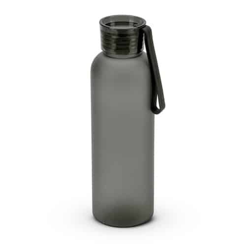 Bouteille de sport en PET recyclé (100% rPET), avec une finition givrée. Couvercle étanche en PS avec sangle en silicone pour faciliter le transport. Capacité jusqu’à 600 ml