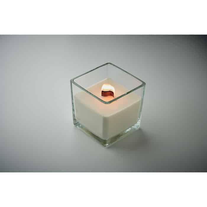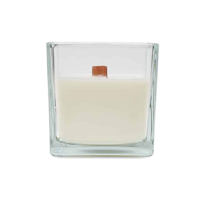 Cire végétale parfumée à la vanille, mèche en bois, verre transparent.