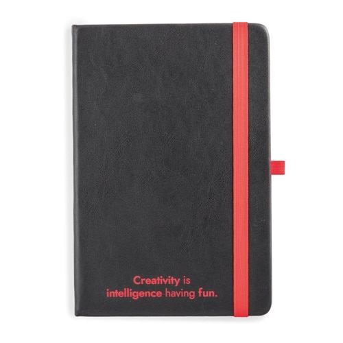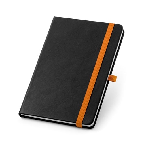 Bloc-notes A5 avec couverture rigide en PU et 160 pages lignées. Bloc-notes avec support coloré permettant la gravure au laser de la couleur de l’élastique. Il est doté d’un ruban marque-page, d’une pochette intérieure et d’un porte-stylo (stylo non inclus)