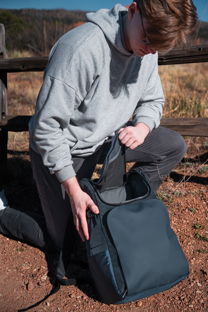 - Compartiment rembourré accessible par une fermeture à glissière latérale, adapté aux ordinateurs portables jusqu’à 15,6 pouces