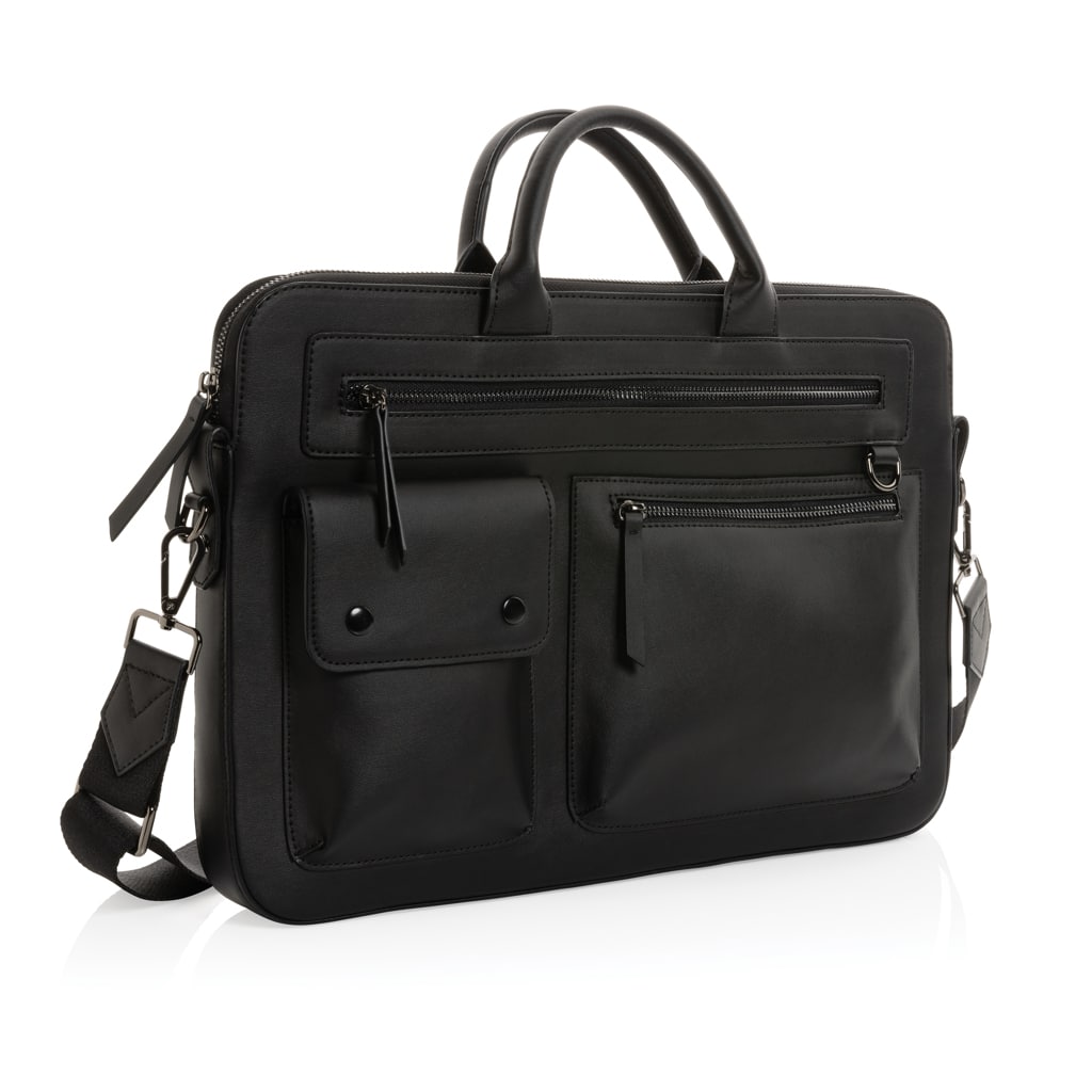 La sacoche ordinateur 14'' Swiss Peak est conçue en PU recyclé certifié GRS, garantissant une production respectueuse de l’environnement avec 61 % de contenu recyclé. Son design moderne et sa finition noire lisse offrent un rendu haut de gamme, idéal pour refléter l’image écoresponsable et professionnelle de votre entreprise. Grâce à sa bandoulière amovible et ses deux compartiments frontaux zippés, elle allie praticité et confort au quotidien.