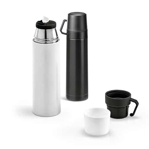 Bouteille thermique en acier inoxydable et PP avec double paroi et tasse. Capacité jusqu’à 490 mL. Fourni dans une boite cadeau