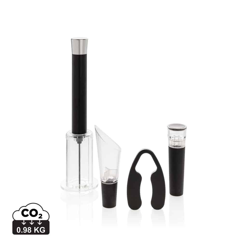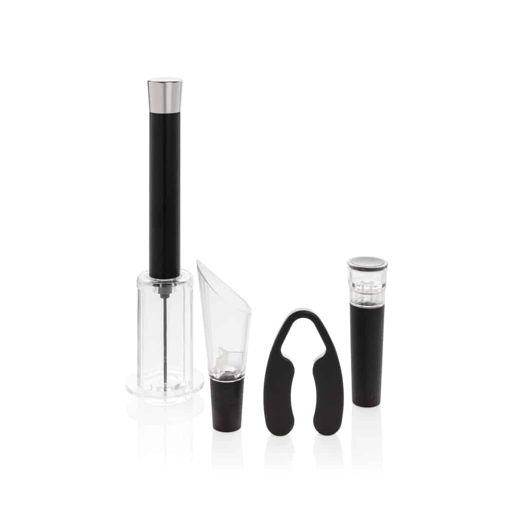 Ce set est conçu pour offrir une expérience de dégustation optimale et pratique. Son tire-bouchon pneumatique permet une ouverture rapide et sans effort, tandis que le coupe capsule assure une manipulation soignée. Le bouchon avec pompe à vide prolonge la conservation du vin après ouverture, et le bec verseur garantit un service élégant et aéré. Ces outils sont parfaits pour accompagner vos dégustations, repas d’affaires ou événements corporate.
