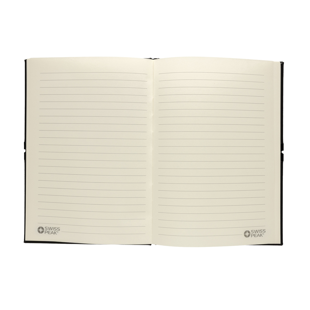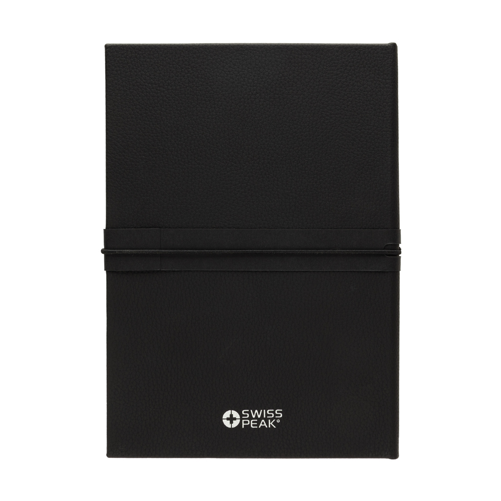 Le coffret inclut également un porte-clés Swiss Peak avec une finition métallique brillante et un bracelet en cuir PU, symbole de qualité et de raffinement. Vous trouverez un stylo à bille professionnel capable d’écrire jusqu’à 1000 mètres, parfait pour les prises de notes prolongées, accompagné d’un carnet à la couverture douce en polyester PU recyclé. Ses 160 pages couleur crème en papier recyclé offrent un espace optimal pour organiser idées, rendez-vous et listes.
