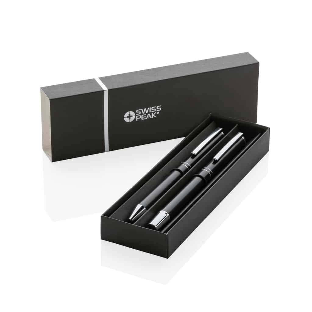 Le set de stylos en aluminium recyclé RCS Swiss Peak Cedar est un objet publicitaire alliant design moderne et durabilité environnementale. Fabriqué avec 17% de matériaux recyclés certifiés RCS, il reflète l’engagement de votre entreprise en faveur de la réduction de l’impact écologique. Chaque stylo offre une expérience d’écriture fluide grâce à son encre bleue Dokumental, avec une autonomie remarquable : 1200 mètres pour le stylo à bille et 400 mètres pour le roller. Livré dans une boîte certifiée FSC®, ce set est un cadeau d’affaires à la fois esthétique et responsable.