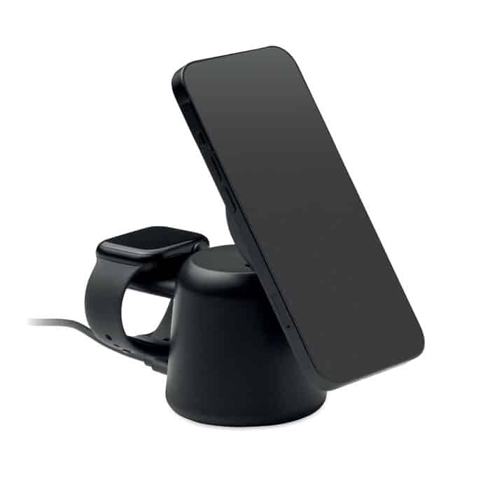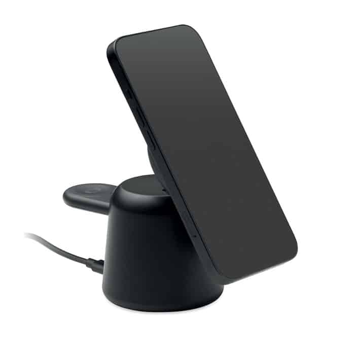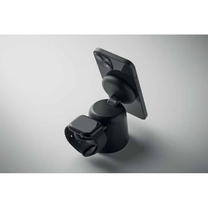 La SIMPA est une station de charge multifonctionnelle en ABS, conçue pour recharger simultanément votre smartphone, vos écouteurs TWS et votre montre connectée (compatible iOS). Dotée d’un chargeur sans fil magnétique de 15W, elle assure une recharge rapide et sécurisée. Son support intégré maintient votre téléphone en position idéale pour une utilisation confortable. Grâce à son anneau métallique magnétique supplémentaire, elle prend aussi en charge les appareils sans aimants compatibles avec la recharge sans fil.