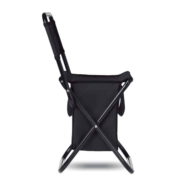 Chaise pliante avec sac isotherme intégré, supporte jusqu’à 85 kg, équipée de sangles pour un transport aisé.