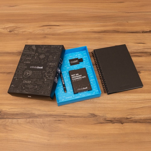 STARTER KIT INFINITEBOOK A5 PLANNER TEXTURE. Kit comprenant un « Infinitebook » à couverture rigide, 1 kit de nettoyage, 1 marqueur et 1 porte-stylo à bille