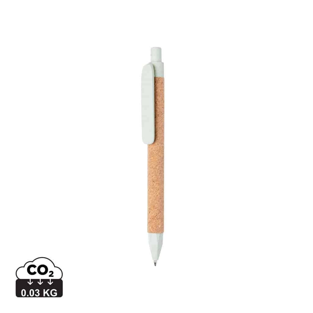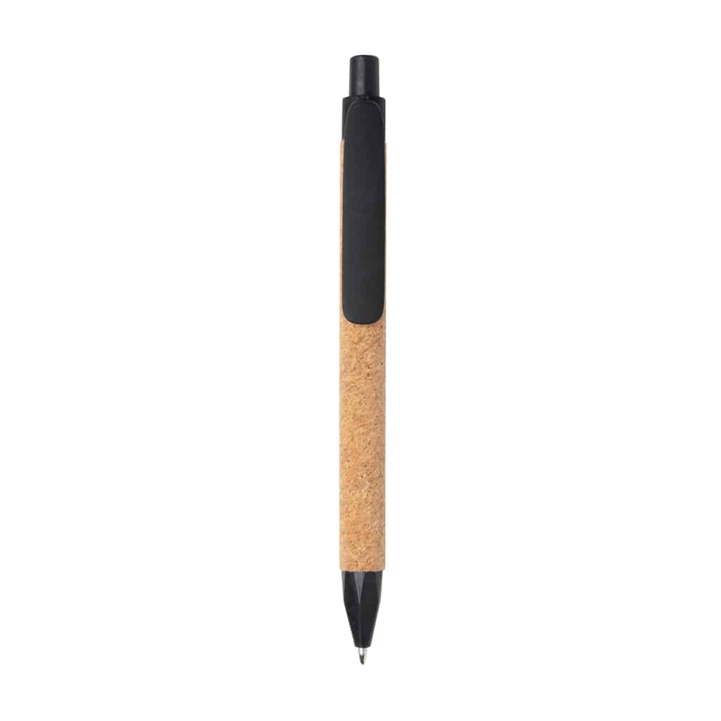 Ce stylo à bille est conçu avec des matériaux recyclés tels que la fibre de paille de blé et le liège, offrant une alternative durable aux objets publicitaires classiques. Son encre bleue Dokumental® de fabrication allemande assure une écriture fluide et nette sur environ 1200 mètres, tandis que la bille en carbure de tungstène garantit une écriture régulière et précise.