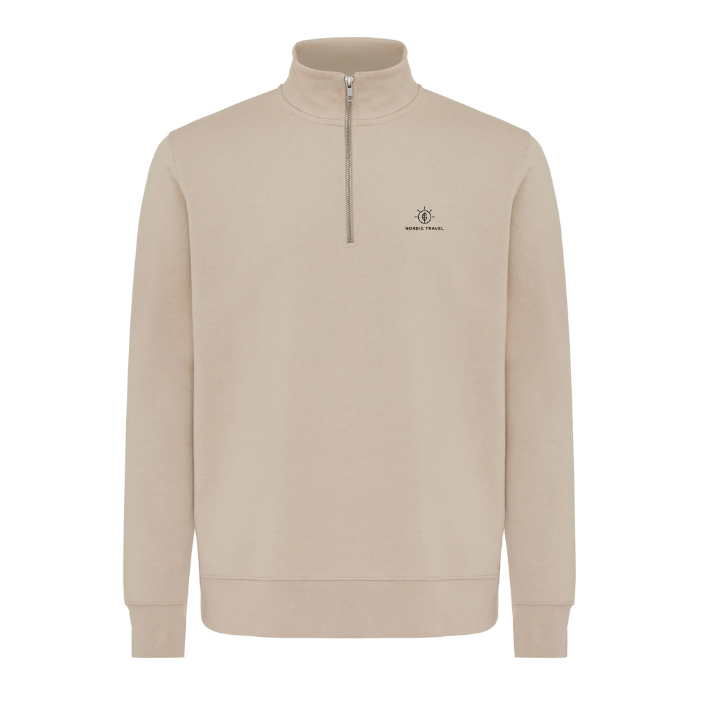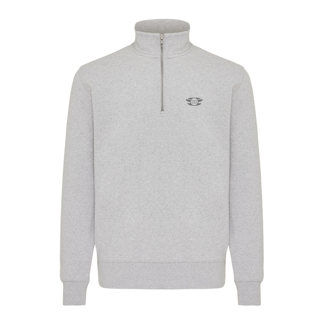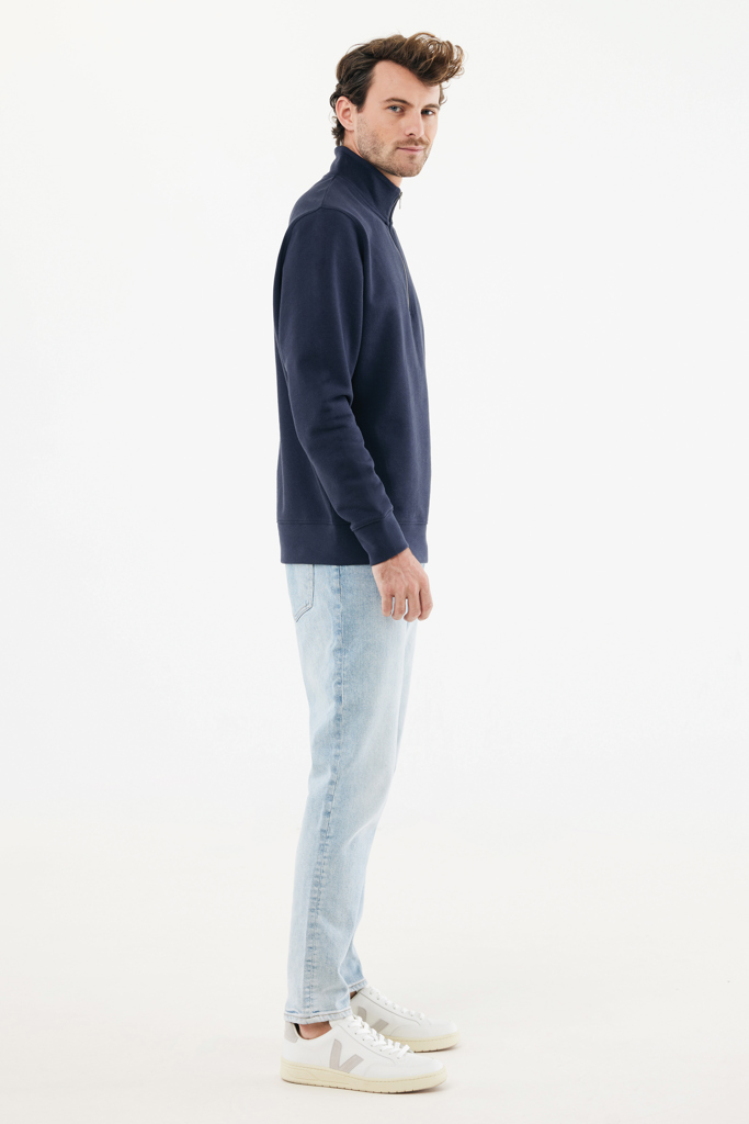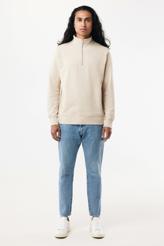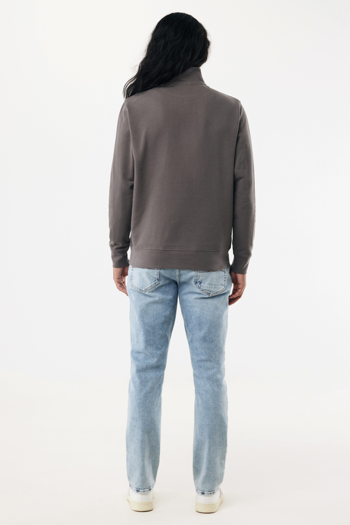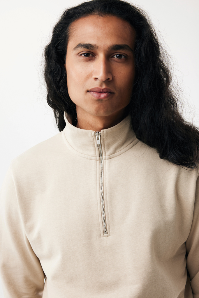 Découvrez le sweater IQONIQ à col montant zippé en coton recyclé, un vêtement écoresponsable alliant confort et modernité.