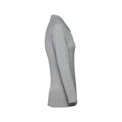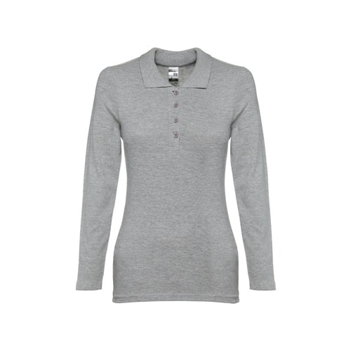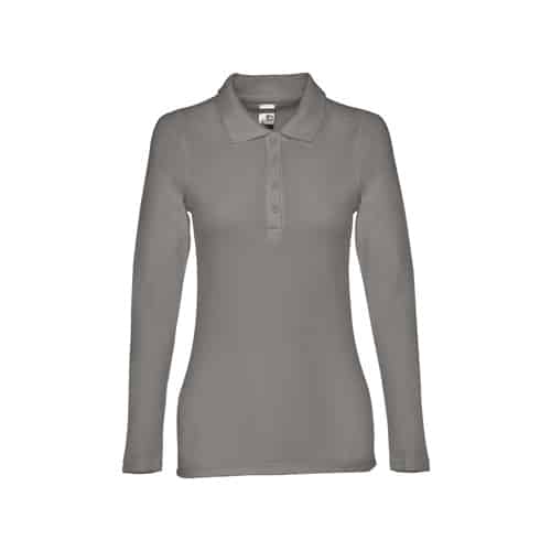 Polo à manches longues pour femme en maille piquée 100% coton (210 g/m²) (couleur 183 : 85% coton/15% viscose). Col renforcé par une bande en maille piqué. Contient une patte de boutonnage renforcée avec 4 boutons colorés (bouton de remplacement inséré dans la couture intérieure). Pièce découpée et cousue avec ouvertures latérales en bas. Étiquette amovible visible