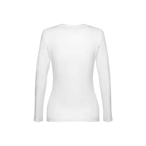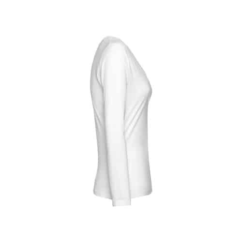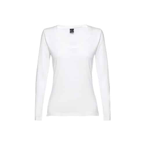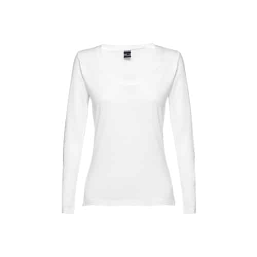 T-shirt ceinturé à manches longues pour femme en maille jersey 100% coton (150 g/m²) avec fil de coton cardé. Coupe moderne avec col renforcé en jersey. Pièce coupée et cousue avec double couture sur les manches et le bas