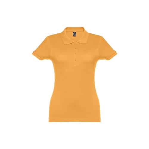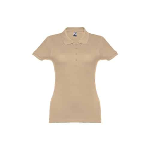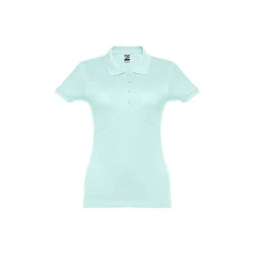 Polo ceinturé pour femme à manches courtes en maille piquée 100% coton (195 g/m²) cardé (couleur 183 :85% coton/15% viscose). Contient un col et des manches côtelés, le col est renforcé avec du ruban piqué. Sur le devant, à côté du col, il y a quatre boutons colorés (bouton de remplacement inséré dans la couture intérieure). Pièce coupée et cousue