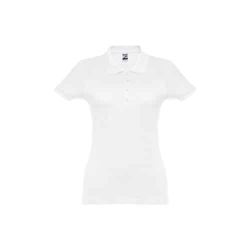 Polo ceinturé pour femme à manches courtes en maille piquée 100% coton (195 g/m²) cardé. Contient un col et des manches côtelés, le col est renforcé avec du ruban piqué. Sur le devant, à côté du col, il y a quatre boutons colorés (bouton de remplacement inséré dans la couture intérieure). Pièce coupée et cousue